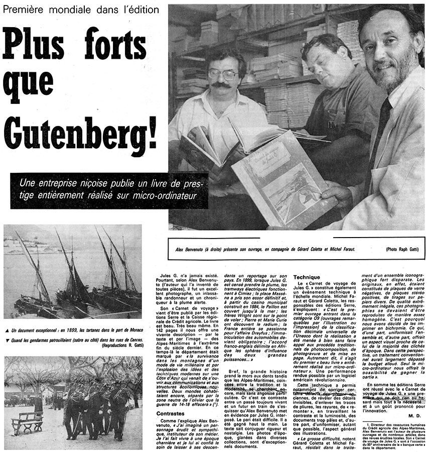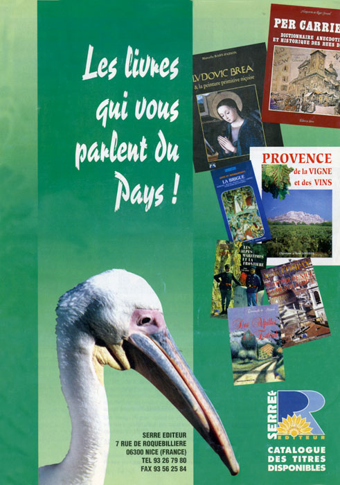 En 1991, Serre publie le tout premier ouvrage français de la catégorie «Beaux Livres» intégralement réalisé sur micro-ordinateur : le Carnet de Voyage de Jules G., d’Alex Benvenuto. La même année voit également sortir des presses la belle étude que Marcelle Baby-Pabion a consacrée au plus célèbre des peintres primitifs niçois de la Renaissance, Ludovic Bréa.